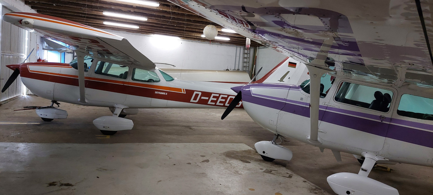Im Hangar geparkt unsere beiden Vereins-Flugzeuge Cessna 172-P (Reims-Cessna - Lizenzbau Frankreich). Sie sind zusätzlich für den Instrumenten-Flug (IFR) ausgerüstet und zugelassen.