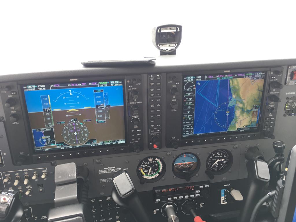 Sogenanntes Glas-Cockpit "Cessna 172 SP". Dieses Flugzeug ist auch an unserem Platz stationiert. Die Cessna befindet sich vor der Spanischen Küste mit Kurs auf Gibraltar (siehe rechter Bildschirm).