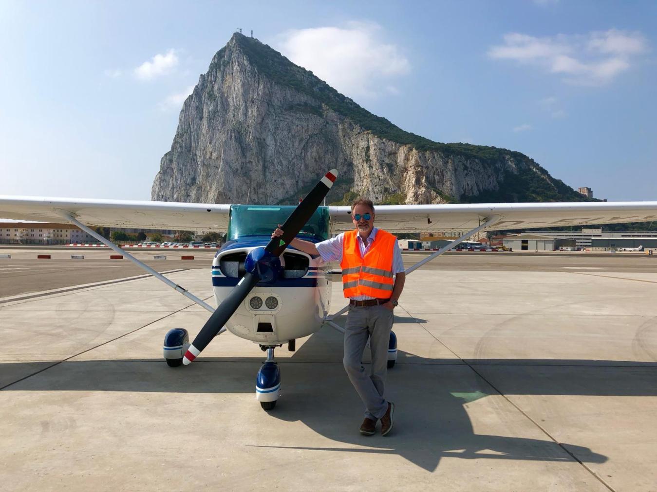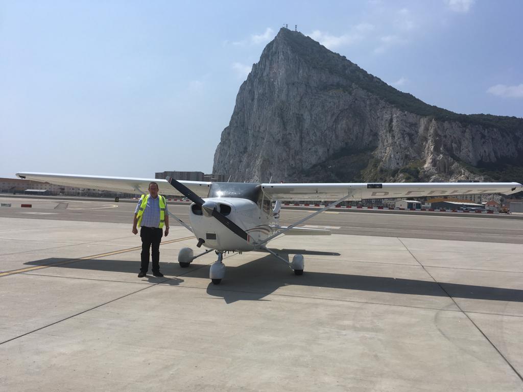 Cessna 172 mit Pilot/Eigner der Maschine auf dem Vorfeld des Airport Gibraltar. Im Hintergrund der Felsen von Gibraltar.